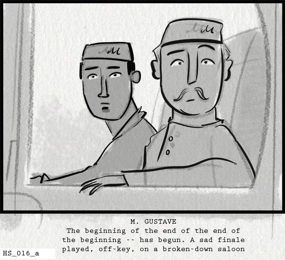 《布达佩斯大饭店》 韦斯·安德森(Wes Anderson)执导,2014年,动画分镜图:杰伊·克拉克(Jay Clarke)绘制分镜图,爱德华·伯施(Edward Bursch)与韦斯·安德森共同完成动画剪辑,2014年,承蒙韦斯·安德森惠允,版权归属探照灯影业
