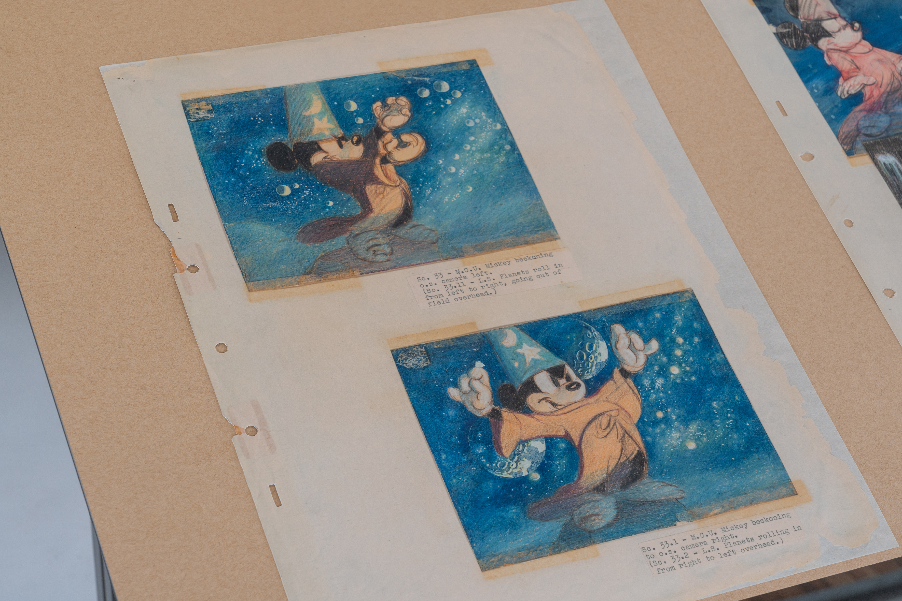 导演Georges Méliès最早运用详细草图构思其科幻电影场景,其代表作《月球旅行记》(Trip to the Moon,1902)便由此创作而成。然而,分镜图真正的起源可以追溯到20世纪初,与动画的兴起息息相关。从1940年起,弗莱舍工作室(Fleischer Studios)、华特迪士尼公司(Walt Disney Productions)以及1940年代的美国联合制作公司(United Productions of America),皆在塑造故事情节与人物形象的同时,委托内部动画师和艺术家创作草图等视觉材料。《一种语言》展出华特迪士尼的开创性经典之作《幻想曲》(Fantasia,1940)图稿,如贝蒂娃娃(Betty Boop)、大力水手(Popeye)、匹诺曹(Pinocchio)、白雪公主(Snow White)和米老鼠(Mickey Mouse),以及其他经典动画角色。从那个年代起,分镜图逐渐演变为动画片及真人影片制作中的重要工具,成为故事呈现具象化和系统化的视觉表达。数十年后,动画项目依然延续着使用分镜图的传统。展览中展出宫崎骏(Hayao Miyazaki)与吉卜力工作室(Studio Ghibli)、邱炯炯以及Andrew Stanton与Lee Unkrich联合执导的《海底总动员》(Finding Nemo,2003)草图便印证了这一点。