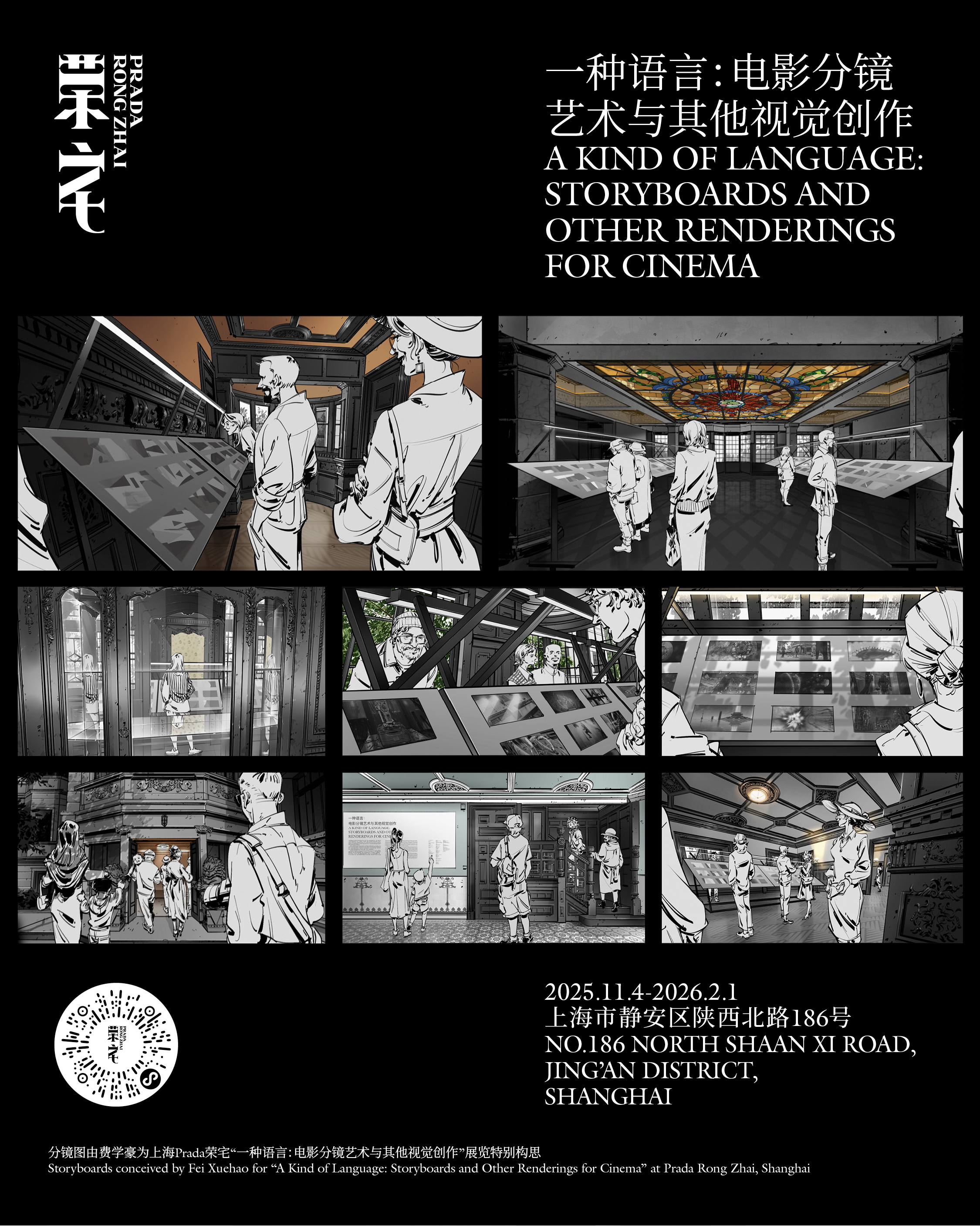 Prada将于2025年11月4日至2026年2月1日在上海Prada荣宅呈现展览《一种语言:电影分镜艺术与其他视觉创作》。