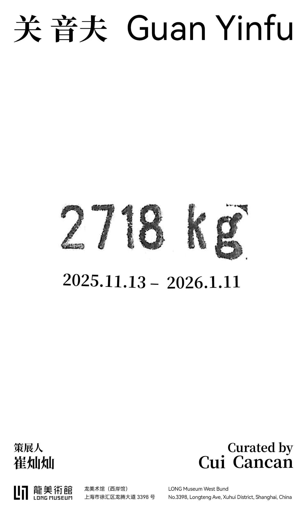 “关音夫:2718kg”由崔灿灿策展,2718 kg是展览的主题,也是展出作品的总重量。关音夫始终致力于对颜色、重量、物质的研究,并成就了他在创作上的独有标签。本次展览基于关音夫对物质的考量,他创作一批与“重量”有关的作品,来重塑艺术和物质之间的关系。作为物质,任何一件绘画作品都有其重量,它是绘画作为物质存在的事实。而基于这个事实,我们赋予绘画不同的文化和精神含义,以超越它的唯物,来形成“意义”,亦是关音夫为我们指出、并揭示的有关绘画的奥秘。
