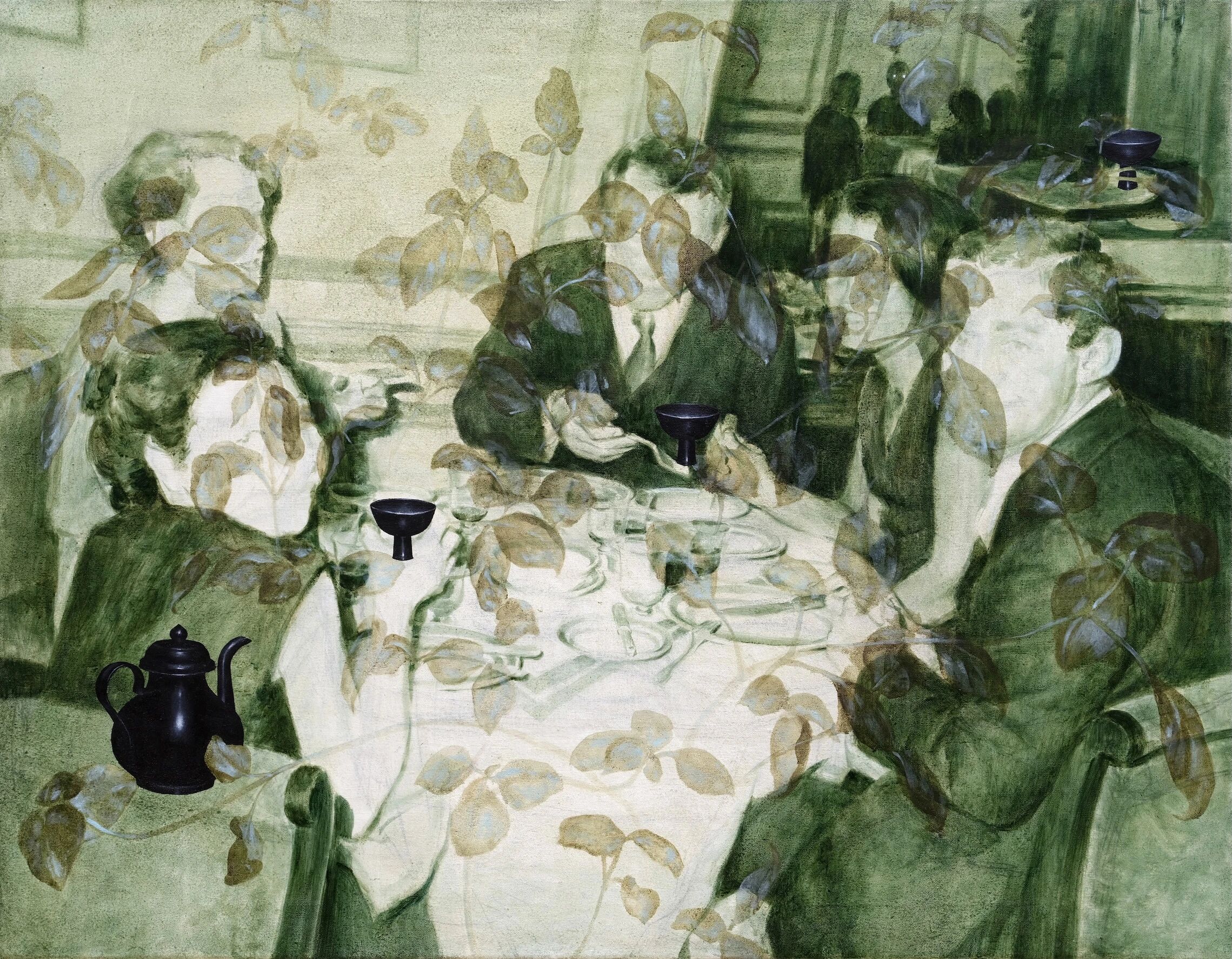 在郑捷予的创作中,绘画与影像之间的关系并非单纯的再现,而是一种关于记忆与再书写的辩证。她常以一张老照片作为创作的底色——或是一场家庭聚会、或是一场内部会议——这些看似私人、却带有时代特征的影像成为作品的图像学原型。在此基础上,她再以植物、酒杯、花草等意象叠加其上,通过类似“正片叠底”的绘画策略,使两个视觉层面相互渗透,形成一种语义的干扰与交叠。这种层叠的视觉结构,不仅是形式上的拼合,更是对“观看”本身的符号学反思——底层图像作为“现实的痕迹”,代表社会与家族的结构性记忆;而上层的添加物,则像是对这些结构进行的再编码(re-coding)与扰动(disruption)。它揭示出私人影像并非中性的记忆容器,而是被文化语境与隐性权力关系塑造的场域。