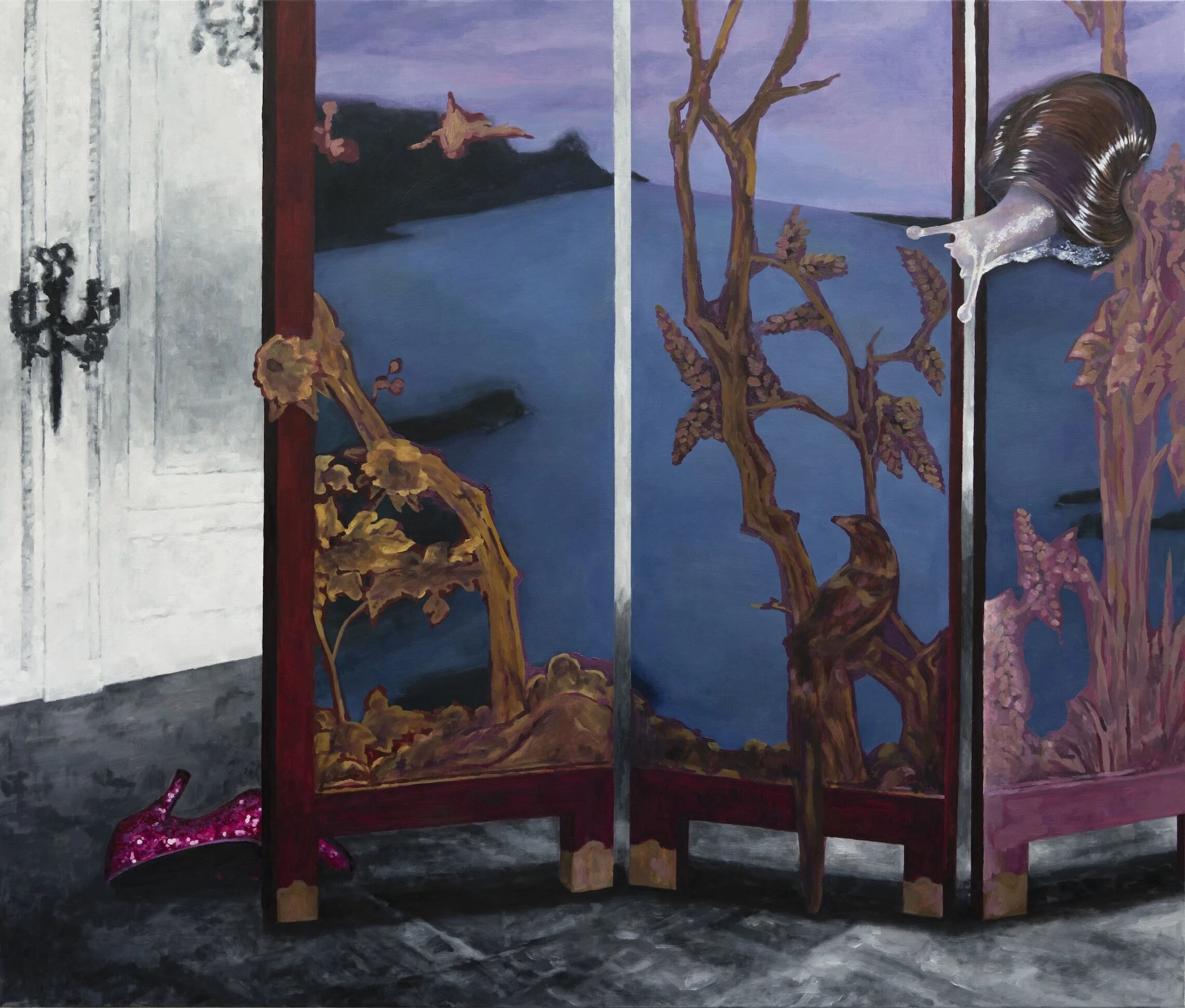 李珺的绘画以女性视角为出发点,构建出一种游离于现实与梦境之间的图像语言。玩偶、手套、茶杯、食人花等意象笼罩在玫红的氛围中,彼此缠绕、错位,形成一种既破碎又妩媚的视觉张力。它们既是身体的延伸,也是社会性别经验的隐喻——作为被遗留的“残余符号”,携带着关于身体、欲望与凝视的复杂脉络,使观看陷入暧昧与不确定的阈限之中。就此,物象在象征与现实之间不断滑动,那是日常的荒谬与紧张,是诱惑与抵抗,是女性经验与文化结构的微妙隐喻场。