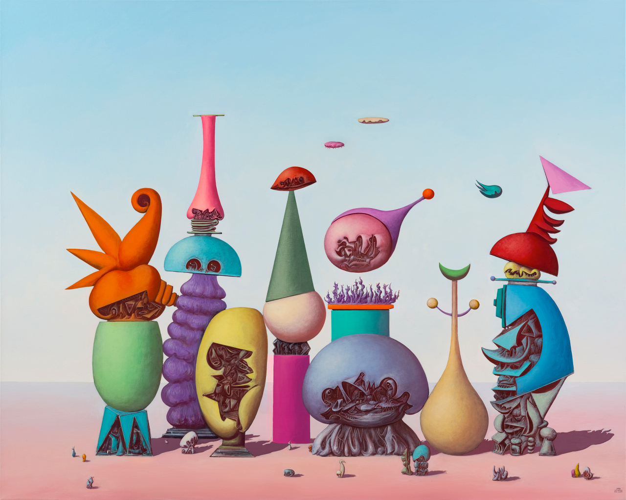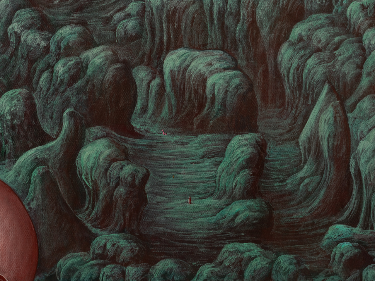 王梵僧的作品除了是一部想象力的珍贵笔记之外,还是一本世界观的哲学论著。从山水题材作品系列“齐谐山志”开始,艺术家打算复活一种被文人画改造前的山水传统。“志怪”系列中形象的丰饶,寓言的奇异,象征的怪诞,令人叹为观止。在中国早期历史观中,怪异不等于虚假,“怪异之事,可以入史”。把世界作为整体来想象的神秘主义世界观,可以追溯到先秦的《山海经》:神怪和山川并不相互独立,它们一起构成了一个完整的超自然世界。神怪与山水定位世界的结构,通过志怪来理解地理,通过地理来构建世界。而在王梵僧自2020年开始创作的全新绘画系列“新世界”中,艺术家将山川地理与人物神怪统一成一个世界空间,一个有着漂亮和纯粹色彩的、感官快乐的世界。万物欣欣向荣,怪物们庆祝存在的快乐,彼此分享生命的喜悦。“新世界”是一个亘古存在、与世俱来的原生世界。