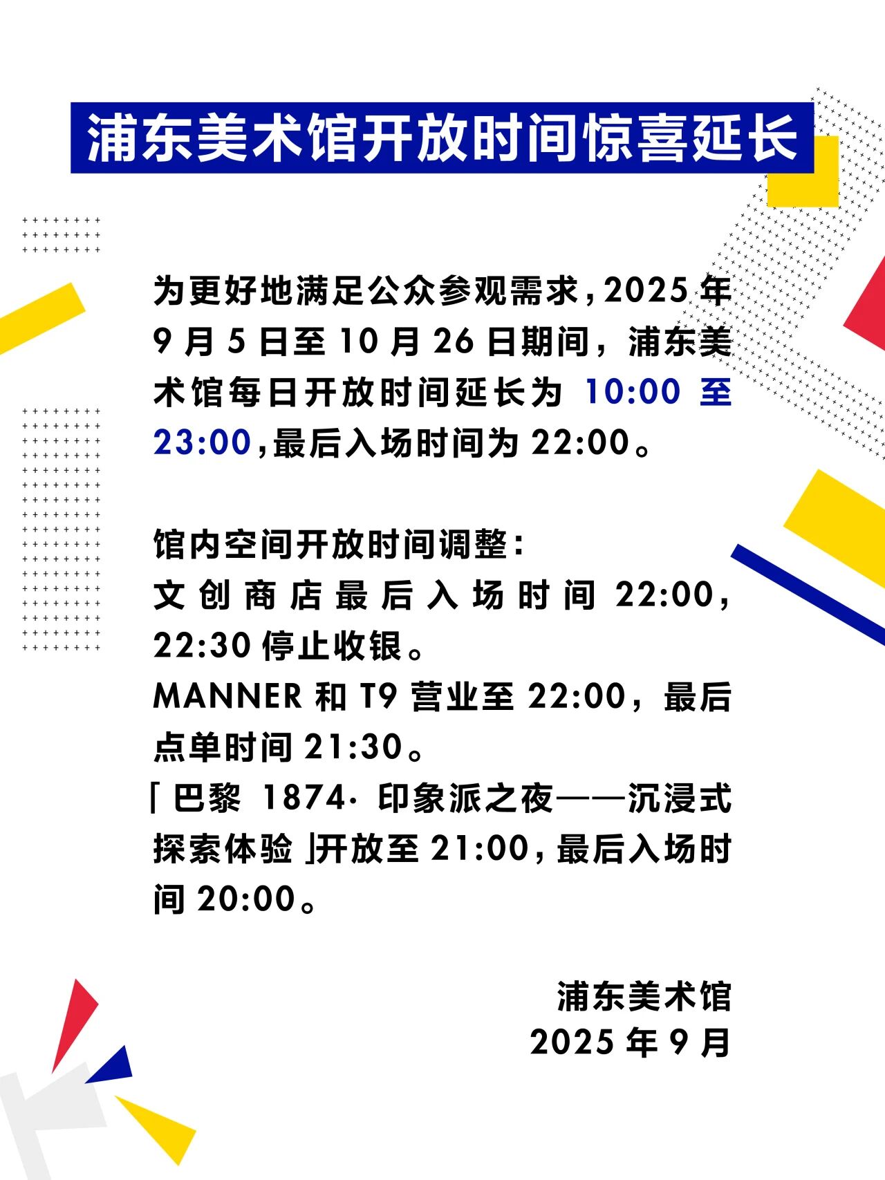 时间:每日10:00-21:00(最后入场时间20:00)(9月5日至10月26日期间延长至23:00,最后入场时间为22:00)