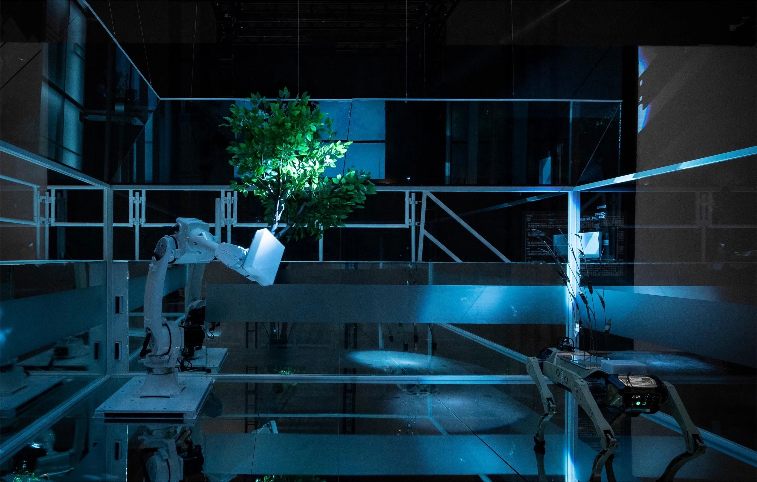 陈抱阳,《智能体共生》,大语言模型驱动的多智能体(四足机器人、机械臂、特制屏幕、镜面),实时演算,500 × 500 × 250 cm,2024