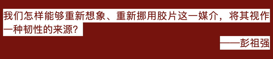 彭祖强关注媒介本身的抵抗性修辞,以此反思历史的局限性与档案的不可抵达。8.75毫米胶片在诞生之初便没有与之适配的摄影机,彼时偏远地区的电影放映仅通过拷贝和特别的缩印制作来流通。换句话说:8.75毫米胶片无法通过拍摄生产新的影像记忆,因此被视作是抵抗生产的“无相机”媒体。