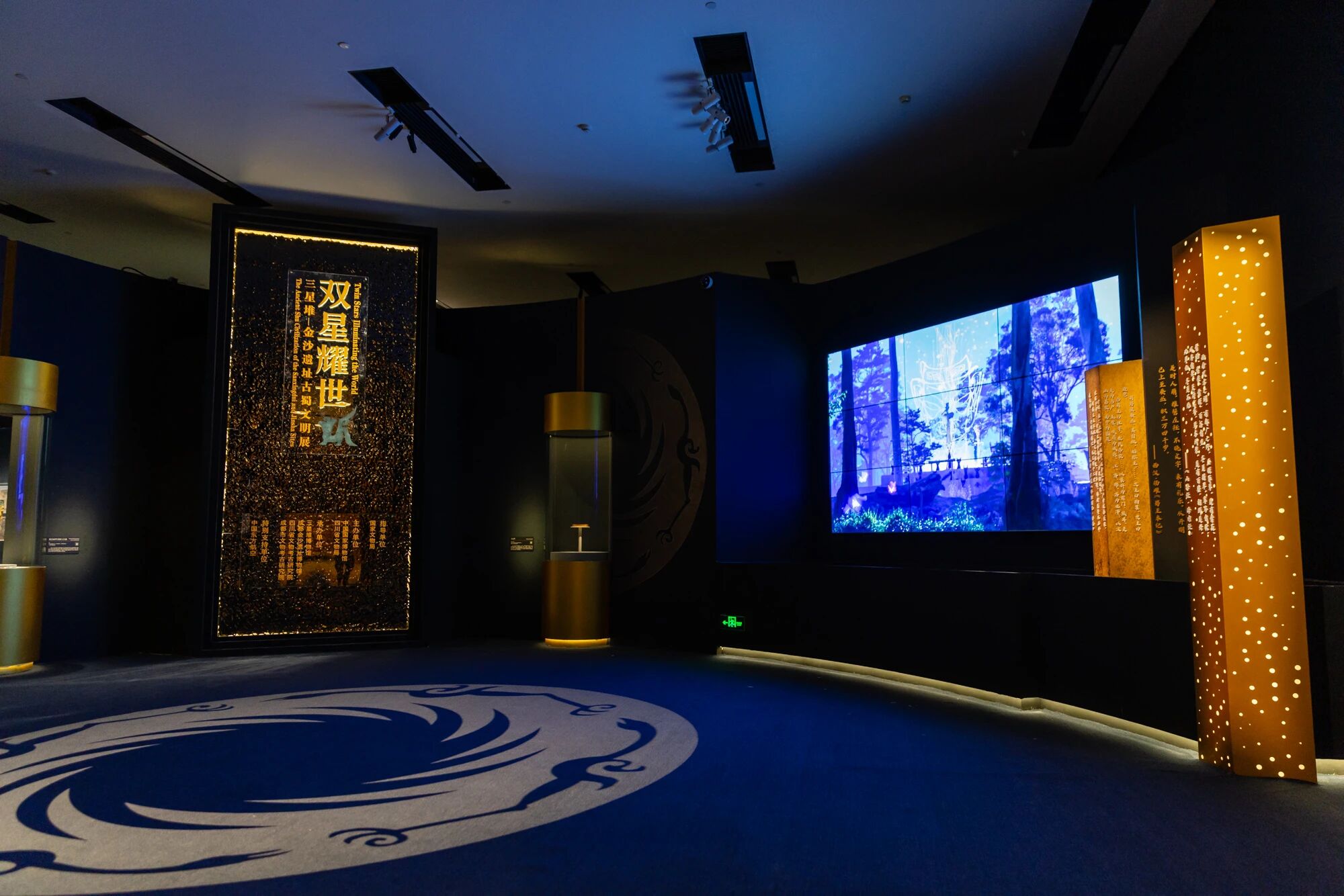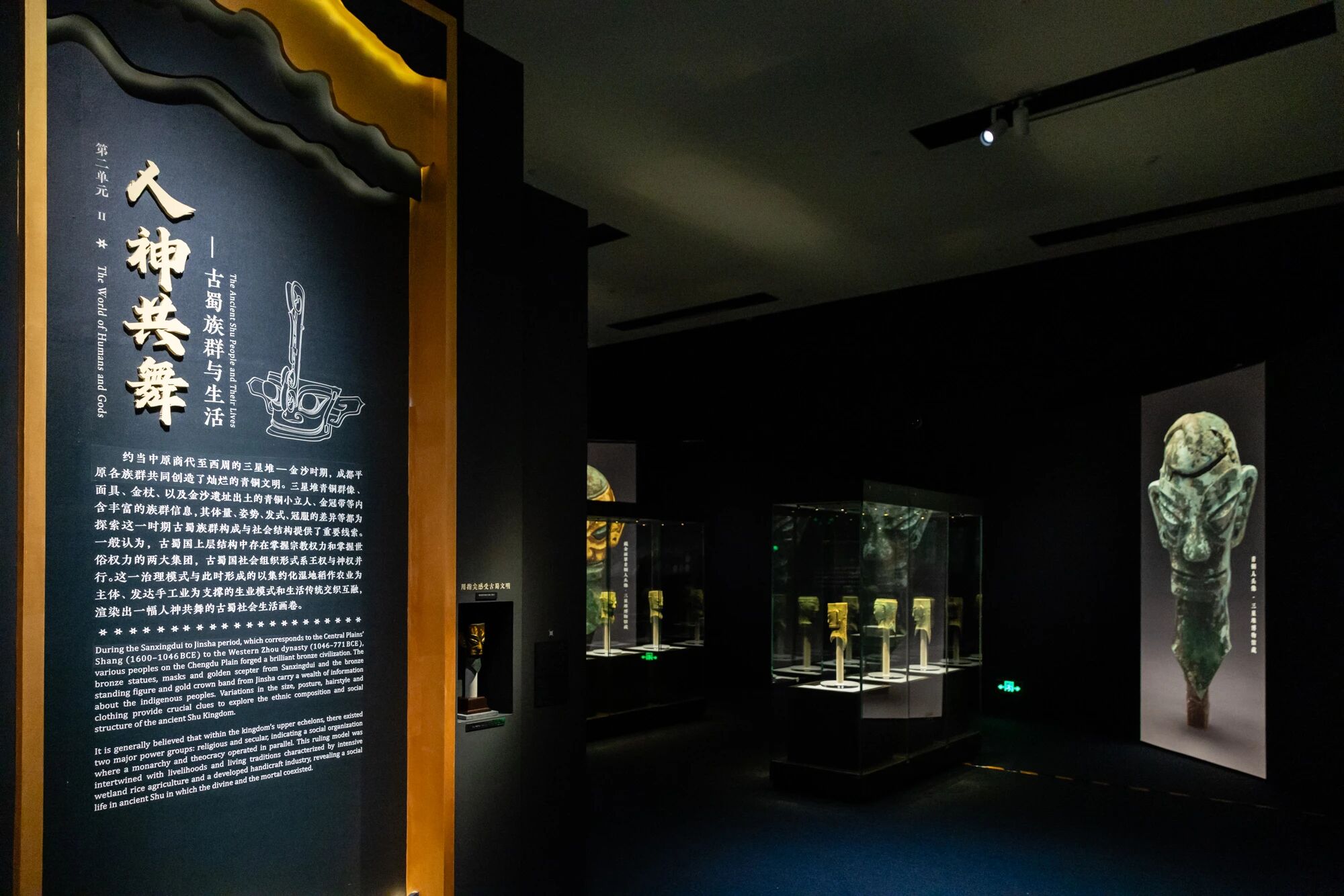 本次展览荟萃三星堆—金沙遗址出土的200余件(套)精美文物,通过“惊世秘藏”“人神共舞”“崇祀天地”“互融共鉴”四个单元,生动呈现三星堆—金沙遗址的考古历程与丰富文化遗存,反映古蜀先民的生活与精神世界,揭示古蜀文明与中原地区及长江中下游地区的密切联系。展品包括金辉璀璨的太阳神鸟金饰,双目如棱的戴金面罩青铜人头像,玄奇诡谲的戴冠纵目面具,以及青铜立人像、龙柱形青铜器、肩扛象牙人形纹玉璋等,这些先民的杰作,共同勾勒出一个瑰丽精彩的古蜀社会,也彰显了中华文明和而不同的宏大气象。