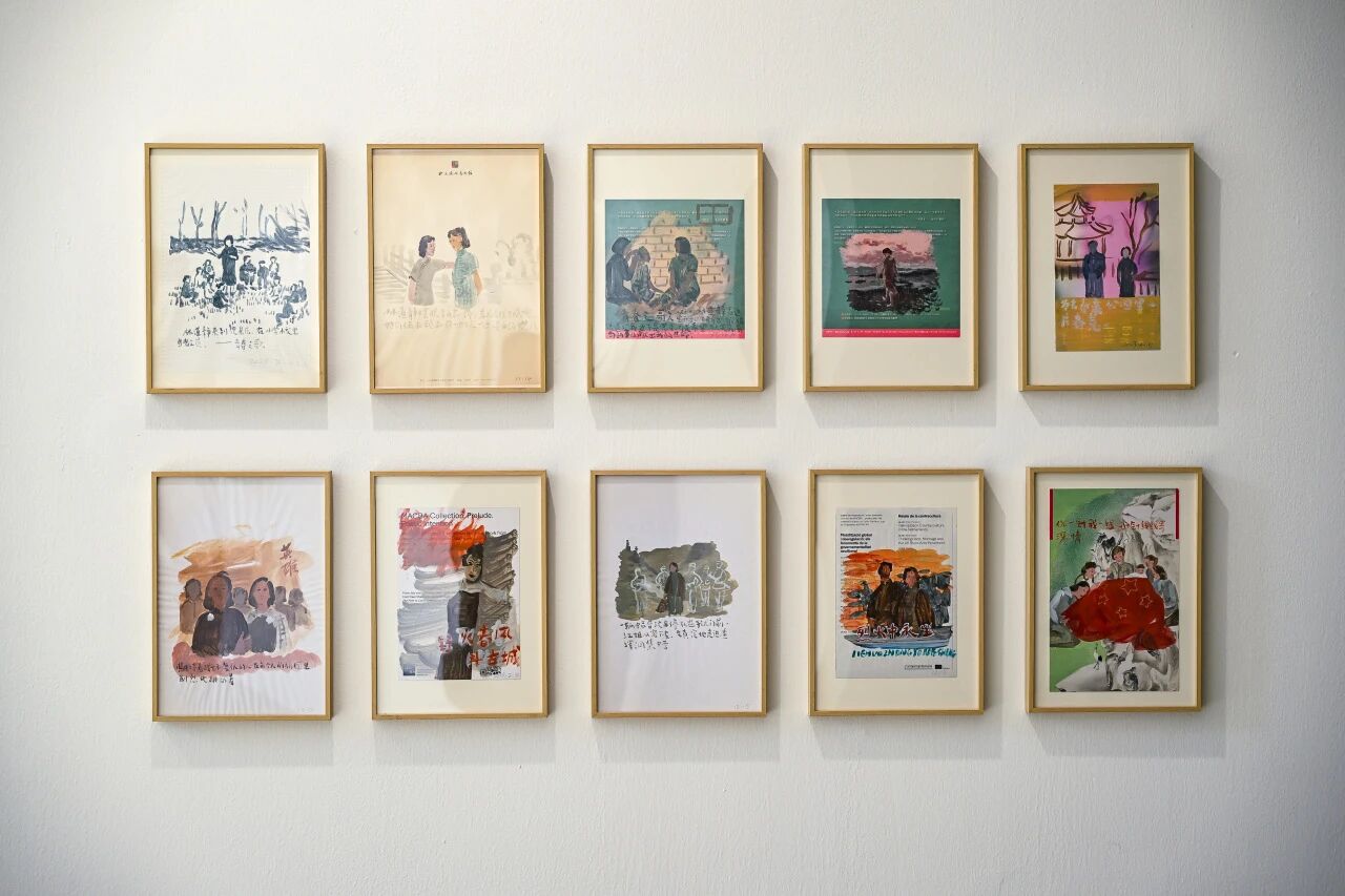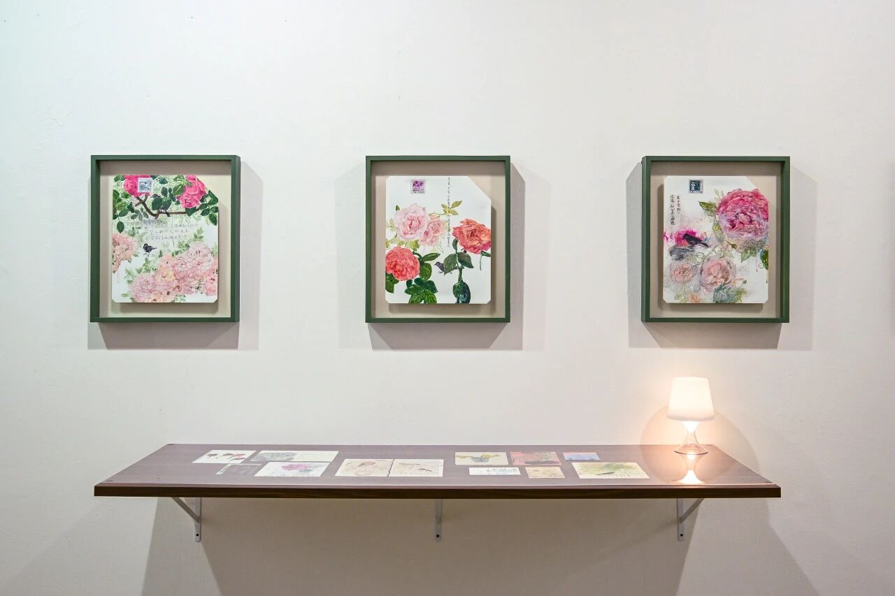 本次展览以“漫游”为线索梳理了她的代表系列:《你看到的语言是今天缺失的》以花丛与文字为载体,将诗意化为视觉符号,画面中的邮票意象承载情感与时间记忆;《日记》系列以旅途纸片、涂鸦与日记文本为媒介,将个人经历与生命状态并置,形成困顿与自由的多重对照;《春天的故事》以80年代书籍、期刊、教科书等怀旧视觉文本为素材,通过泛黄、磨损等细节,重建时代语境下的集体记忆;《灯火阑珊处》则以拼贴手法融合音乐、影像、旧物与记忆碎片,在媒介层次与笔触肌理中,完成对青春记忆的细腻表达。